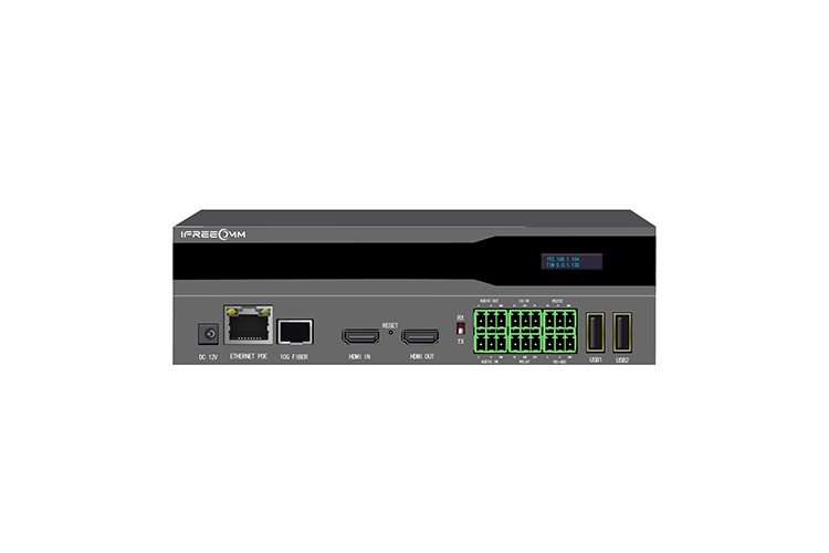 OLED顯示屏,標準H.264/H.265協議,最高支持4K@60編碼,具有一個千兆網口、一個光纖接口,支持光網雙網絡熱備份,一個HDMI輸入口、一個HDMI環出口,一個音頻輸入口、一個音頻輸出口,一個RS-232接口、一個I/O接口,一個IR接口,兩個USB接口,KVM功能。